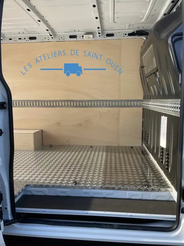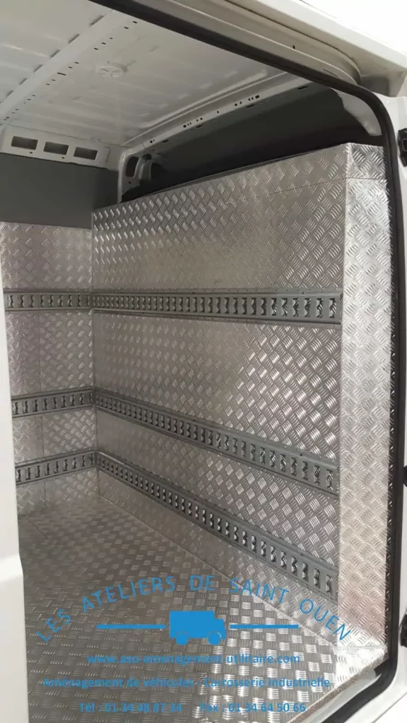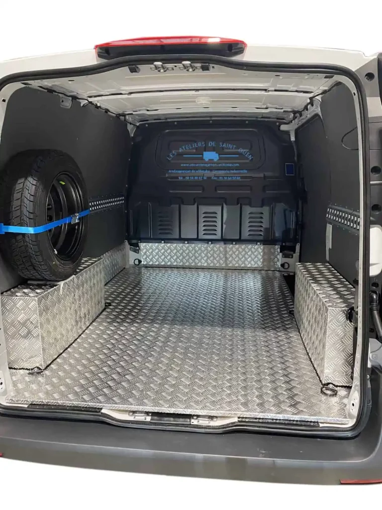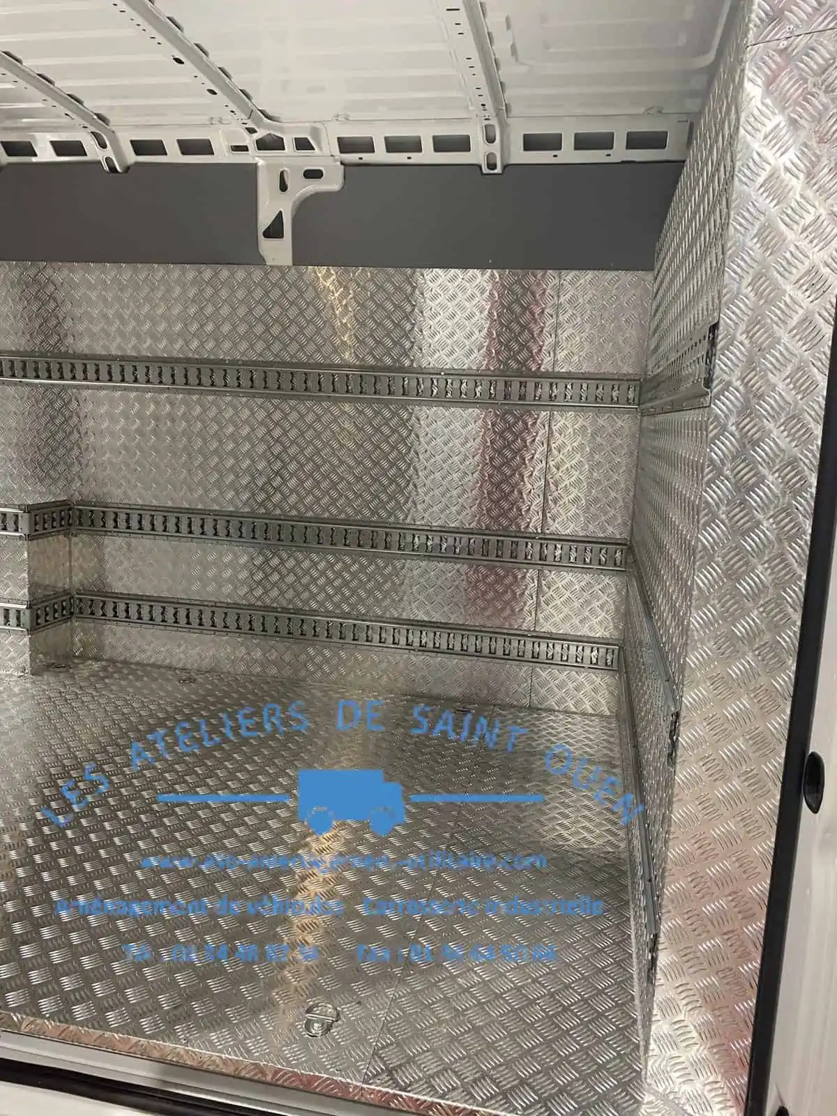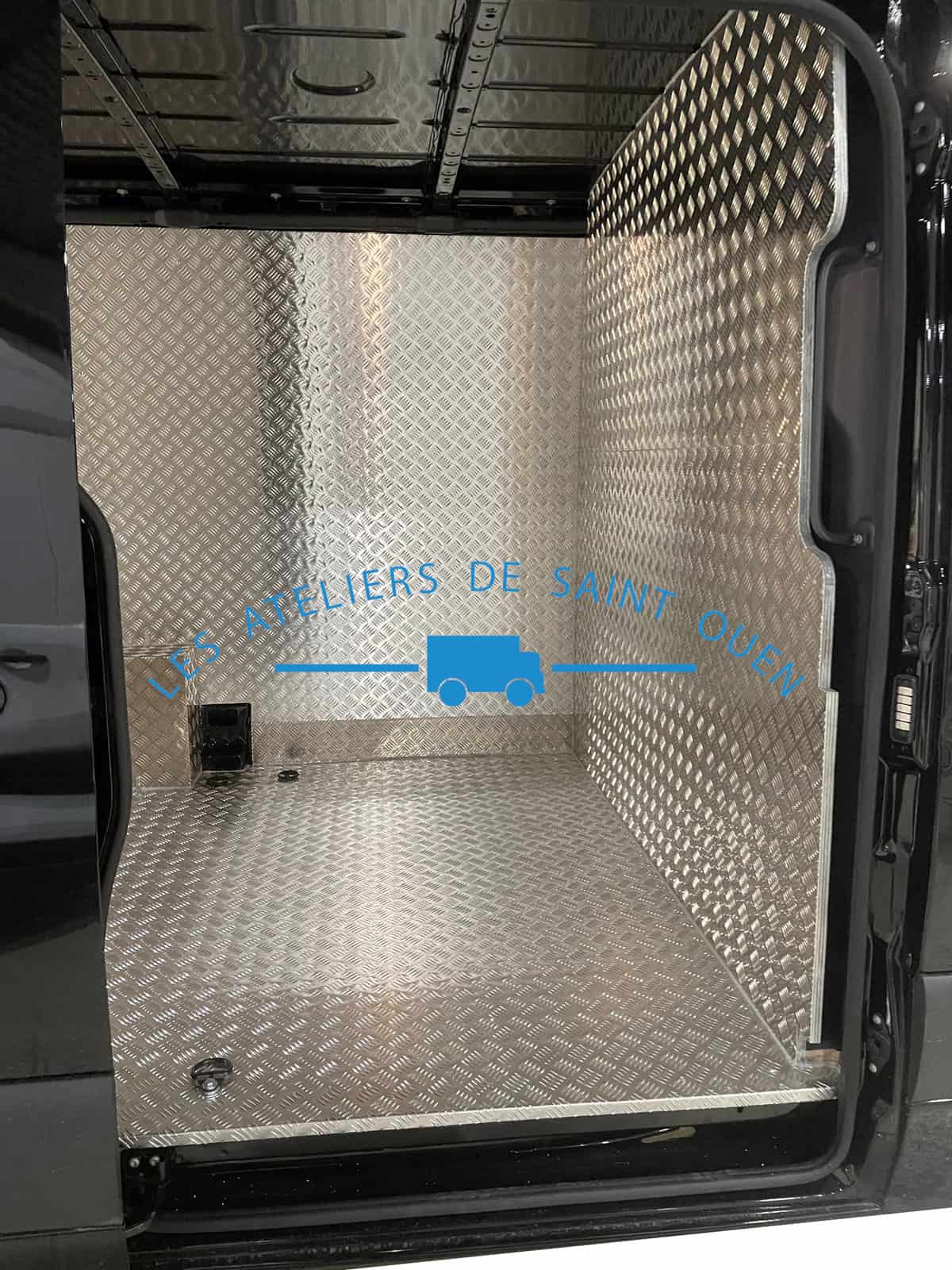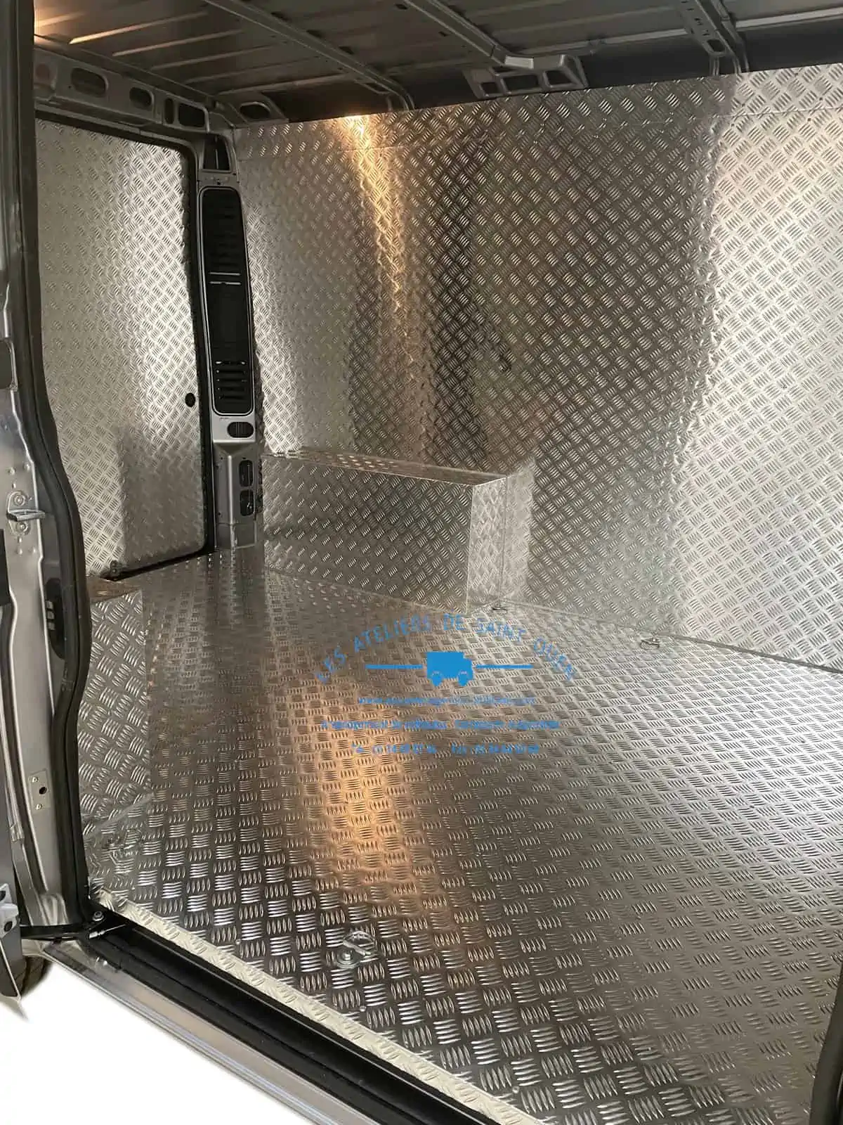 Les Ateliers de Saint-Ouen vous proposent un aménagement sur mesure en aluminium strié, épaisseur 2/3,2 mm, idéal pour les professionnels transportant des charges lourdes ou des matières réglementées.