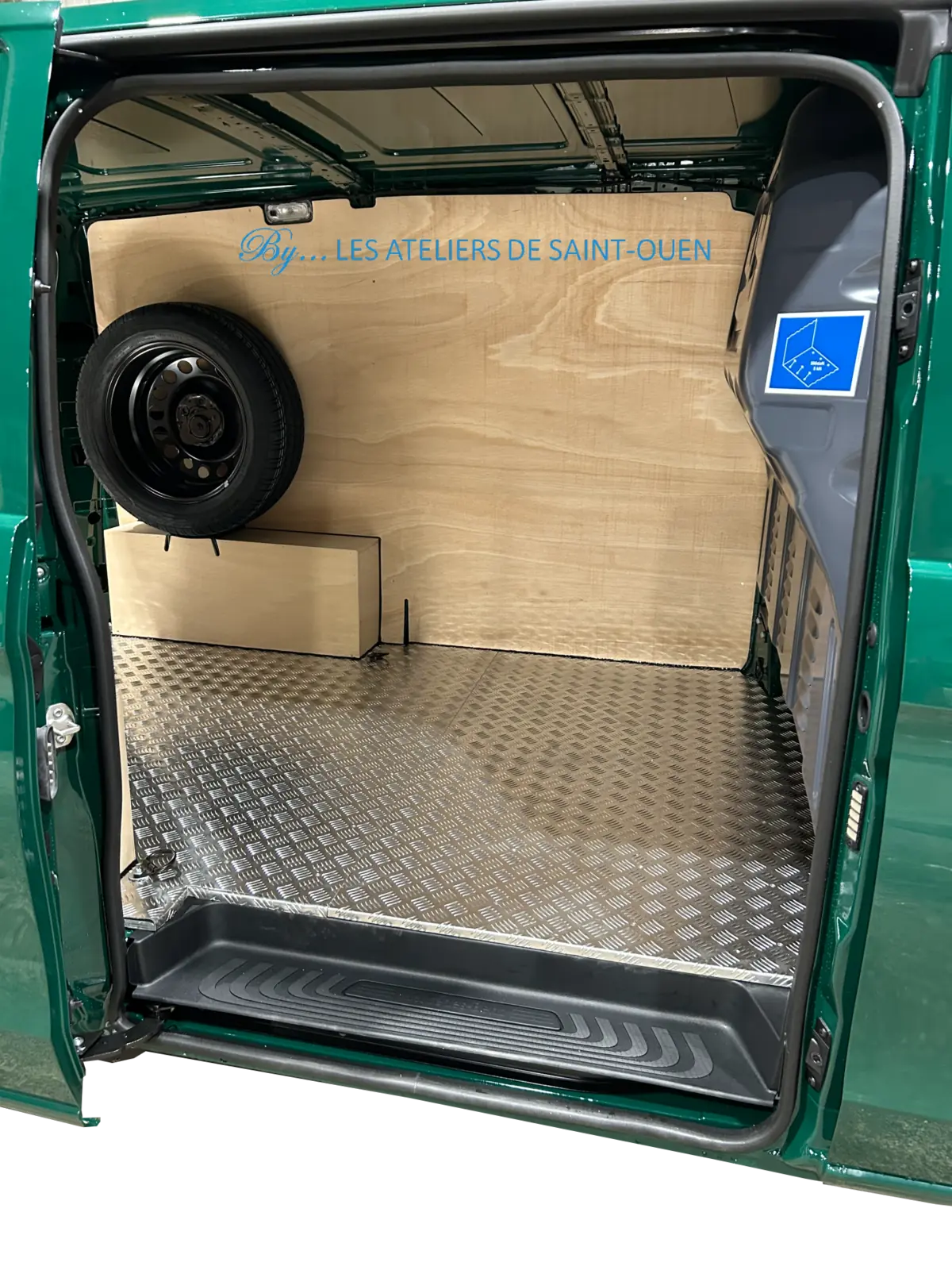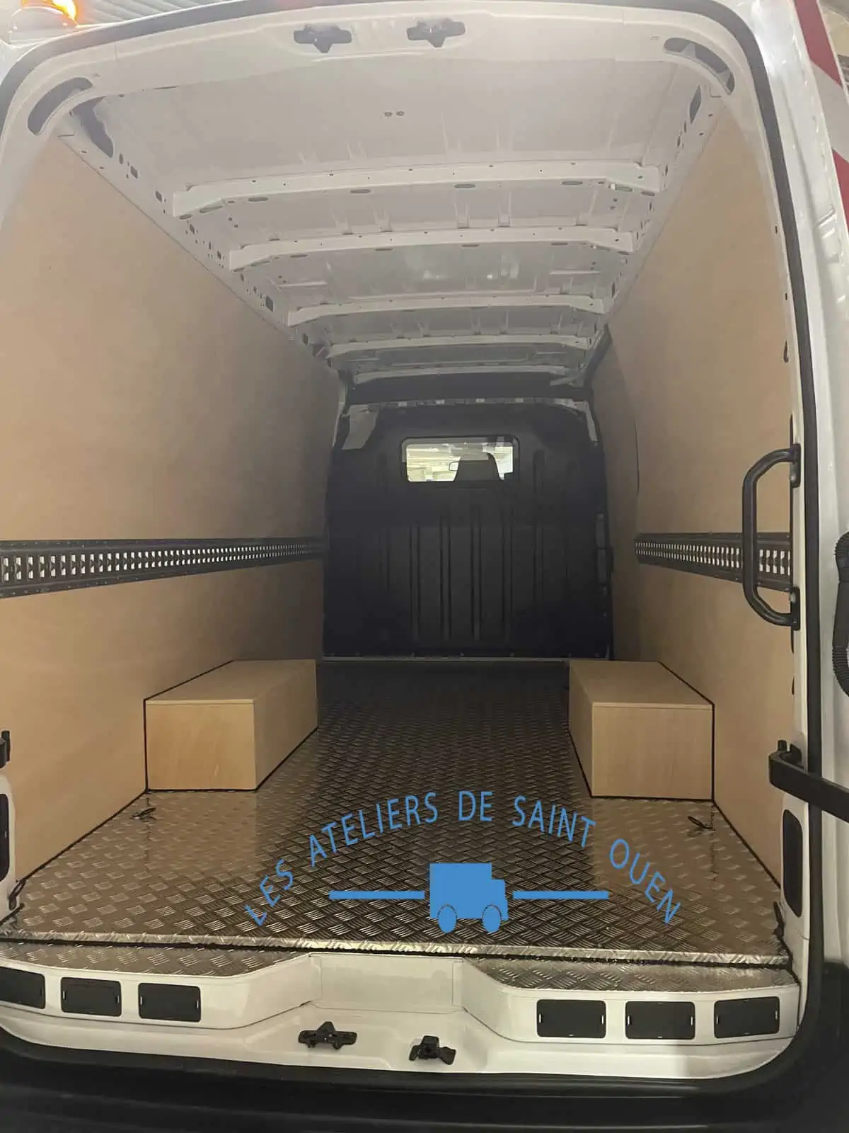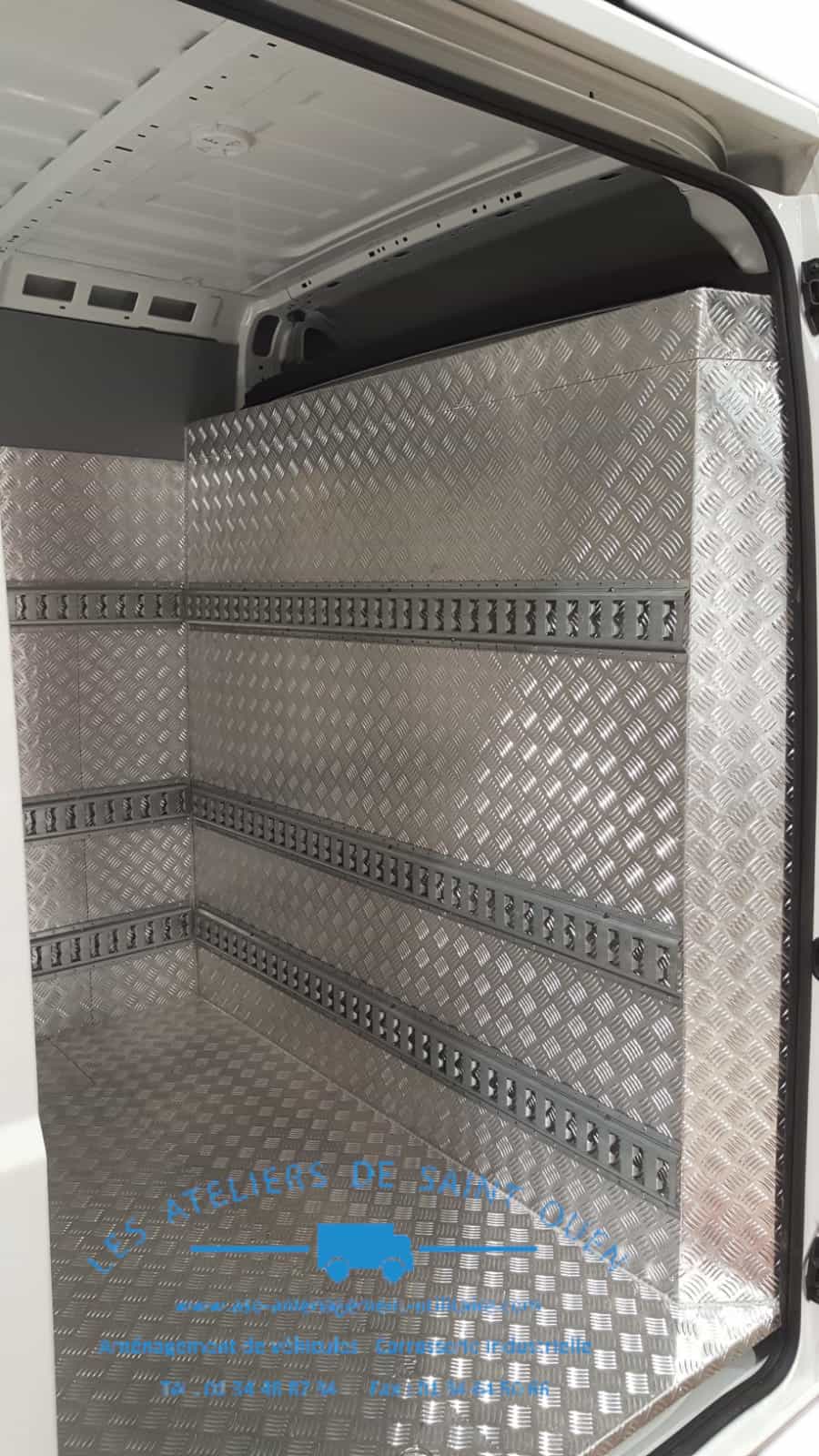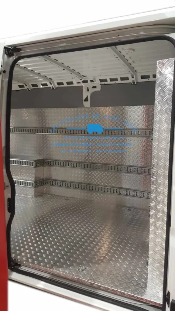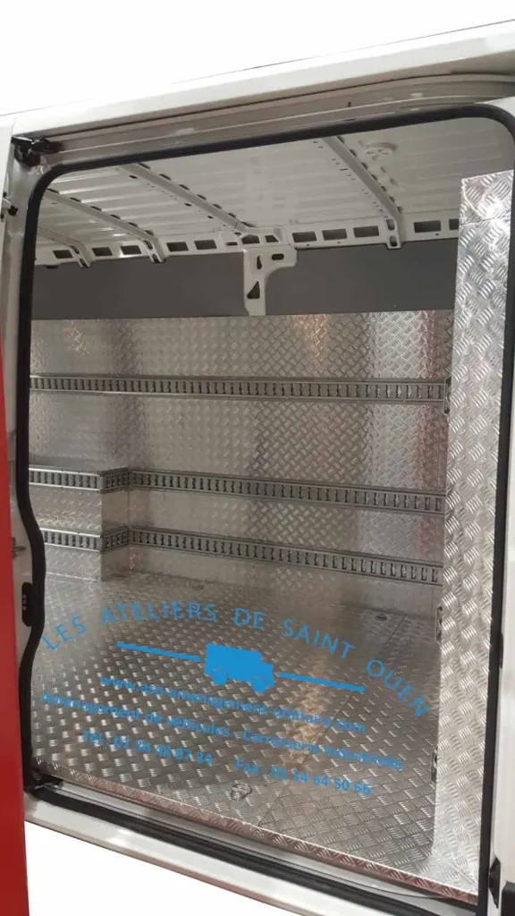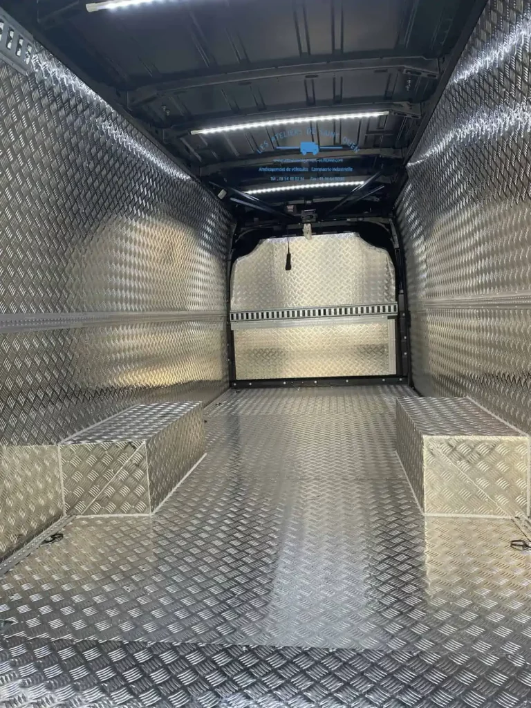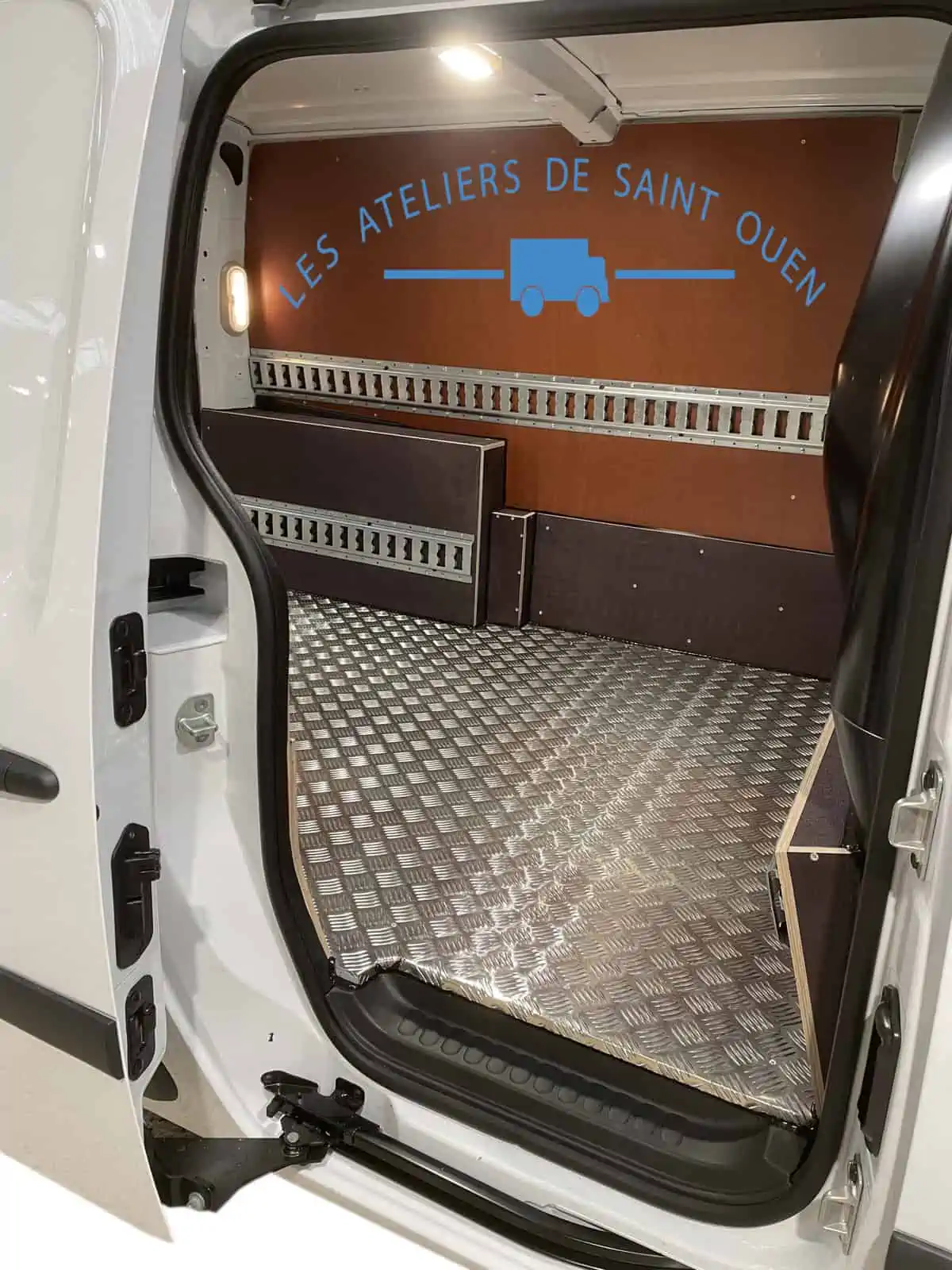 Les Ateliers de Saint-Ouen vous proposent un aménagement sur mesure en aluminium strié, épaisseur 2/3,2 mm, idéal pour les professionnels transportant des charges lourdes ou des matières réglementées.