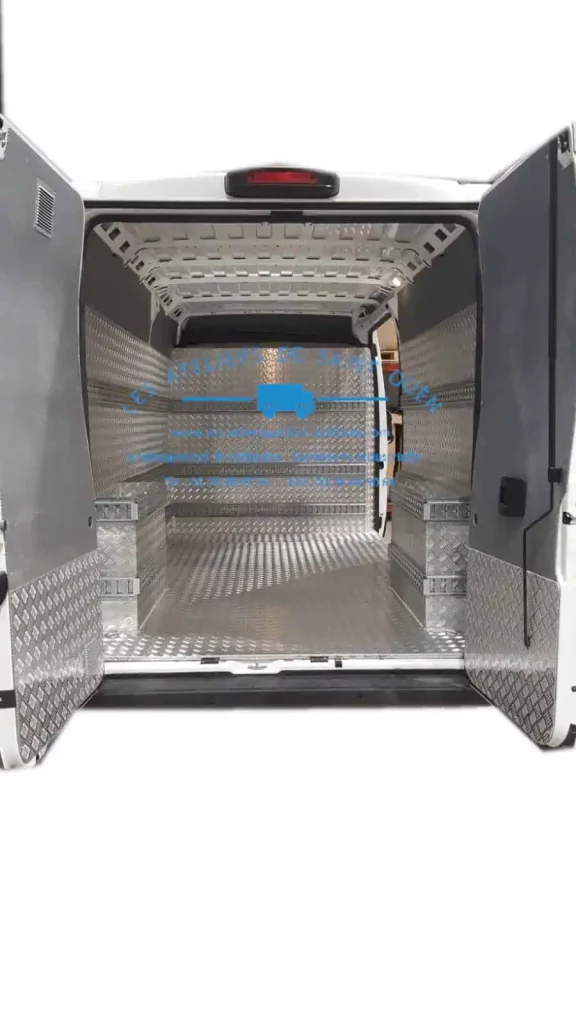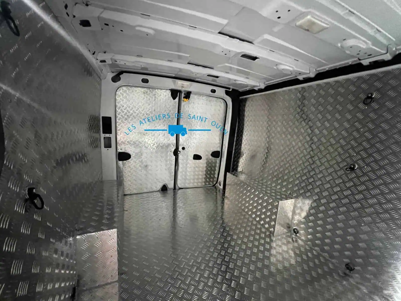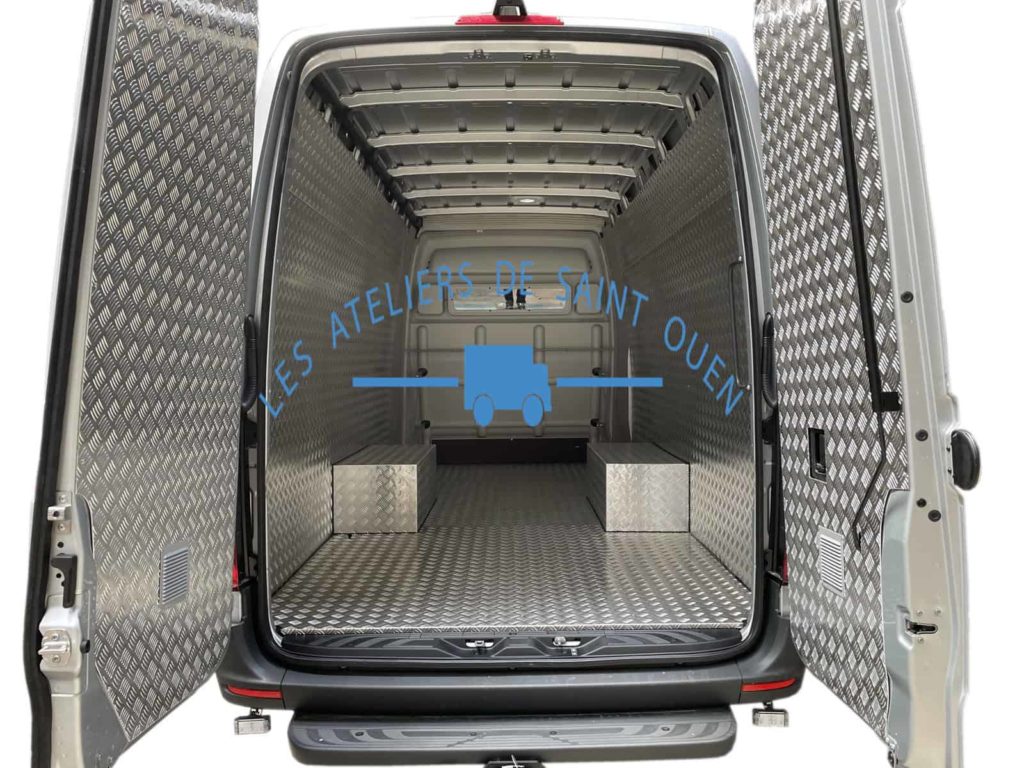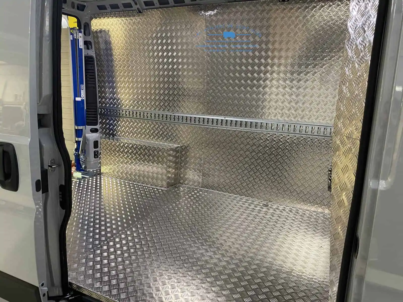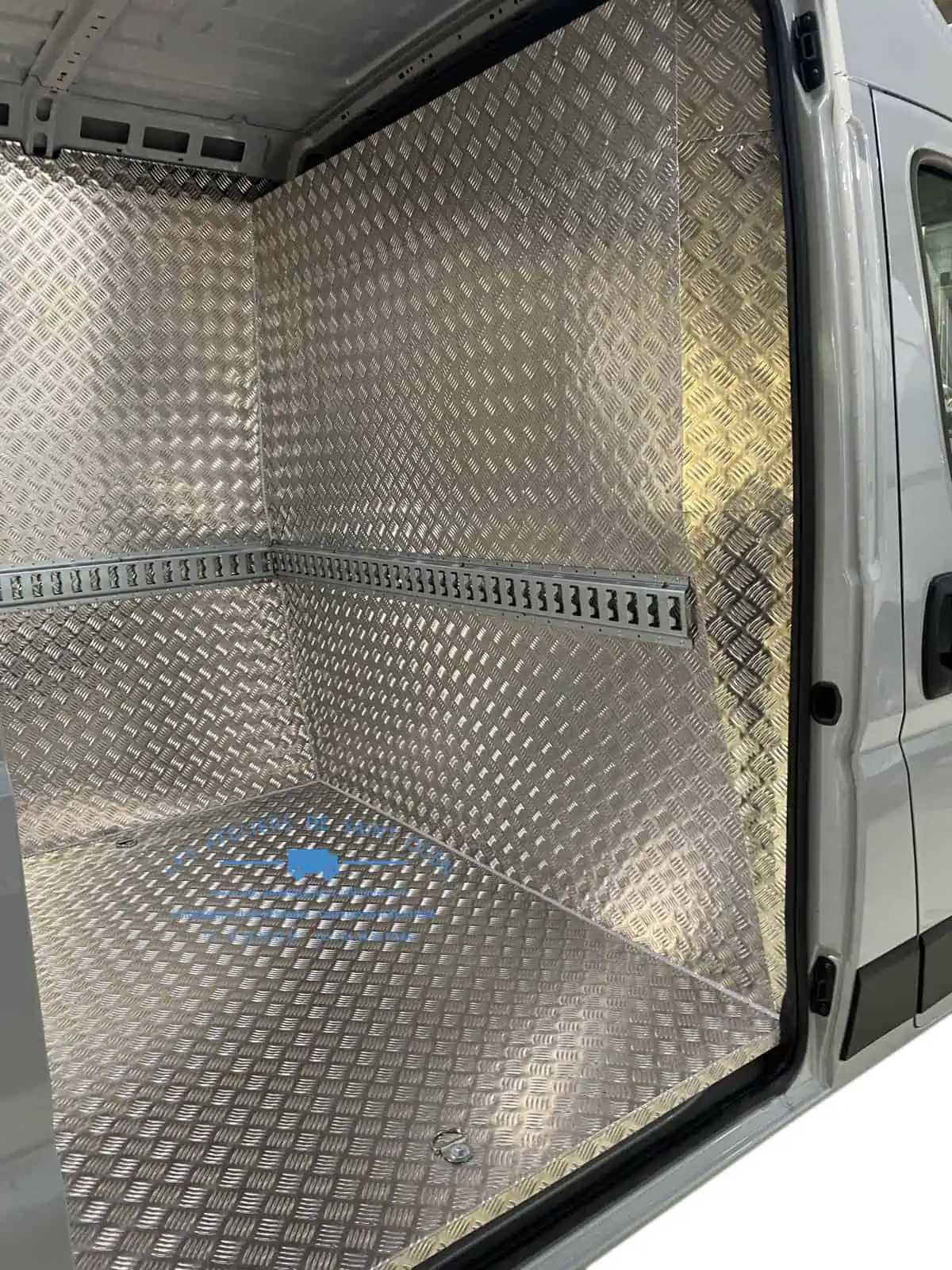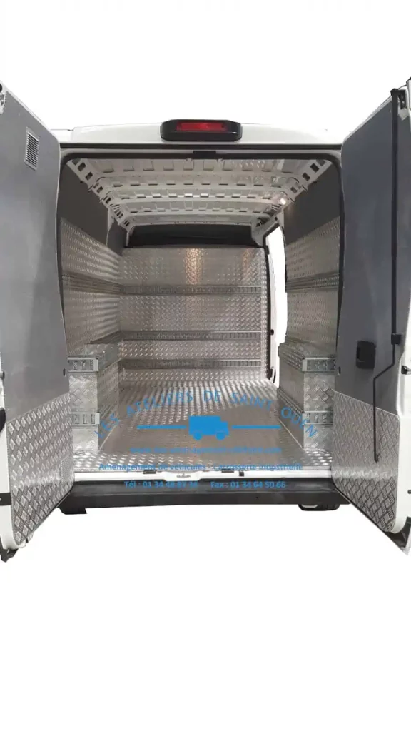 Les Ateliers de Saint-Ouen vous proposent un aménagement sur mesure en aluminium strié, épaisseur 2/3,2 mm, idéal pour les professionnels transportant des charges lourdes ou des matières réglementées.