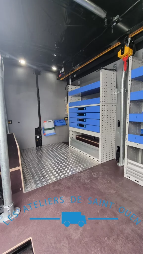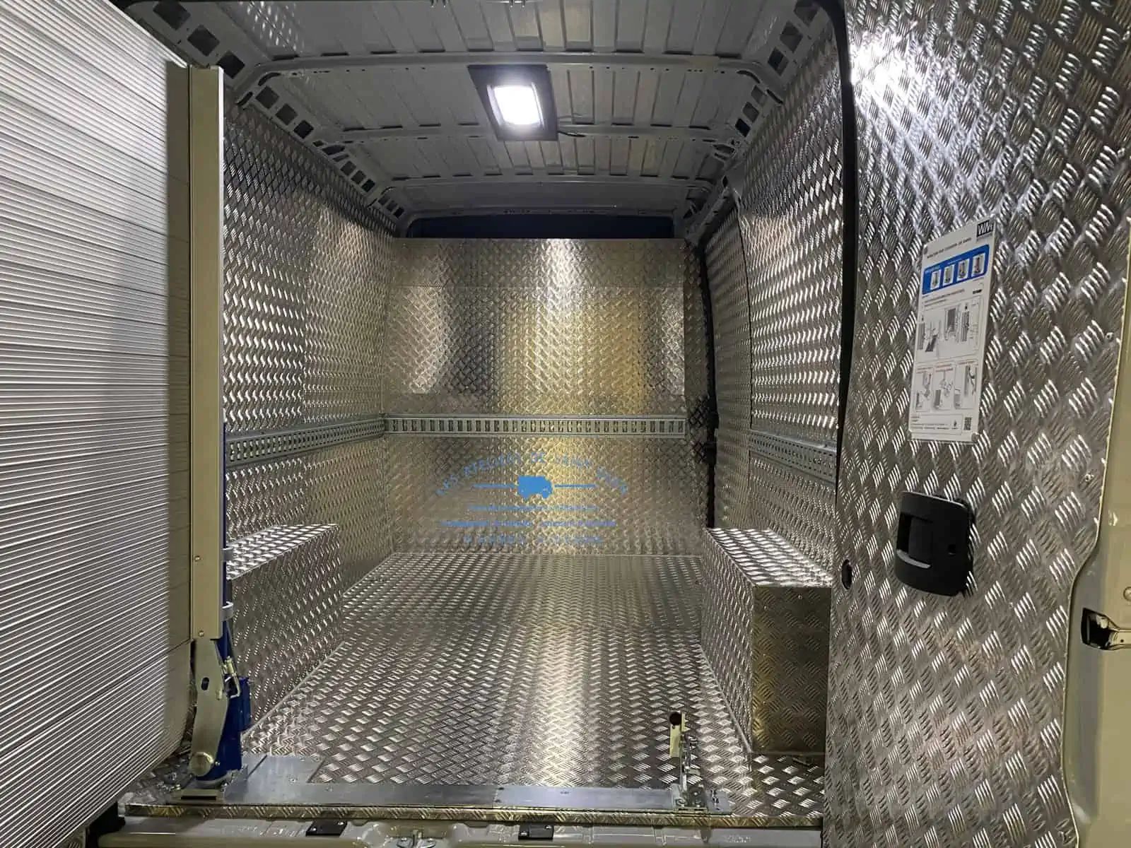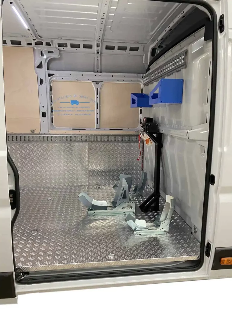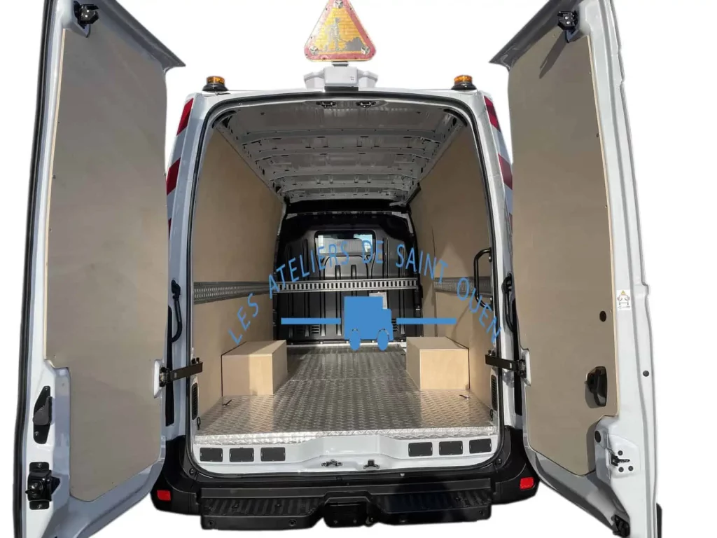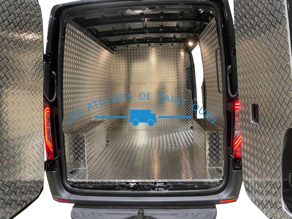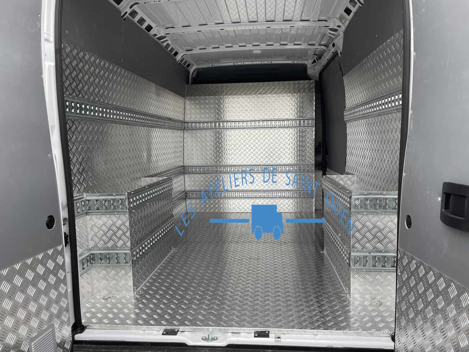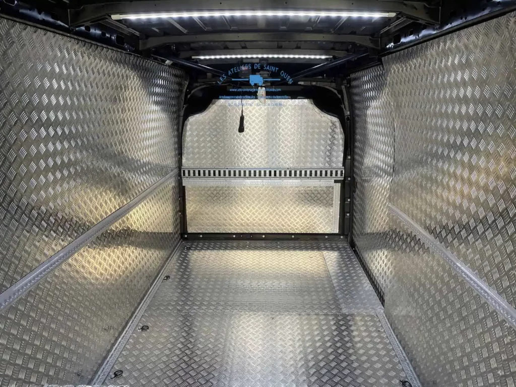 Les Ateliers de Saint-Ouen vous proposent un aménagement sur mesure en aluminium strié, épaisseur 2/3,2 mm, idéal pour les professionnels transportant des charges lourdes ou des matières réglementées.