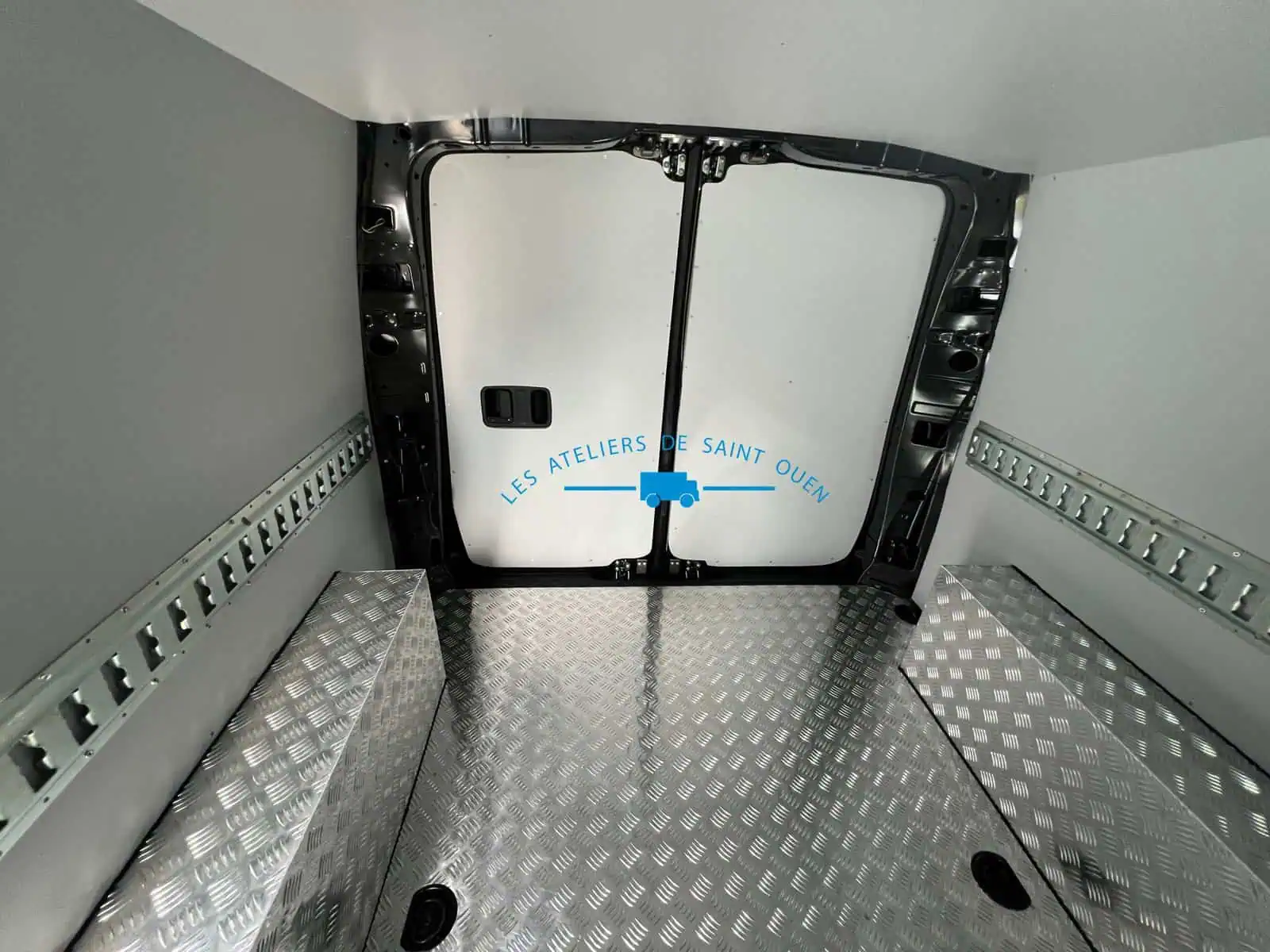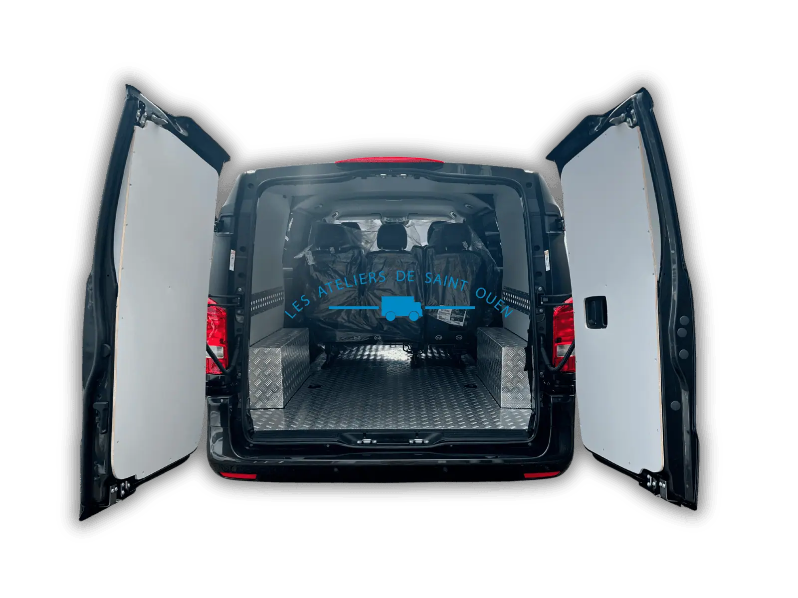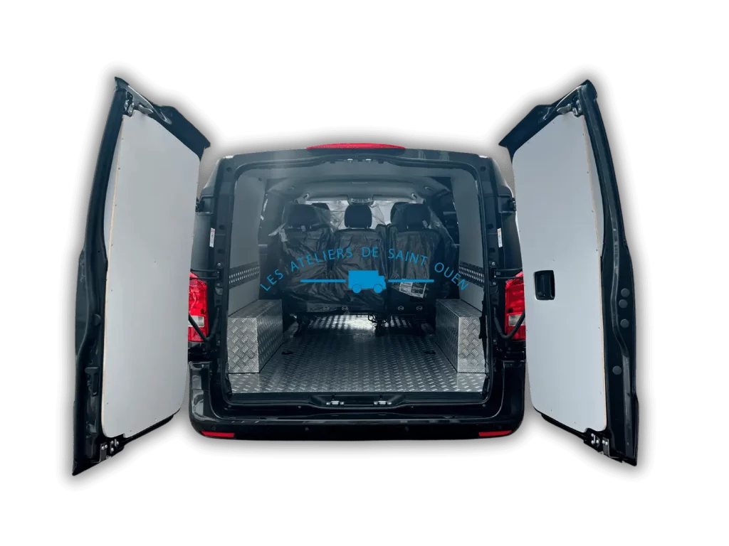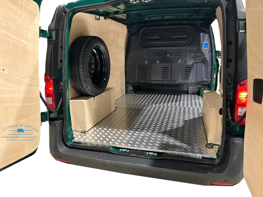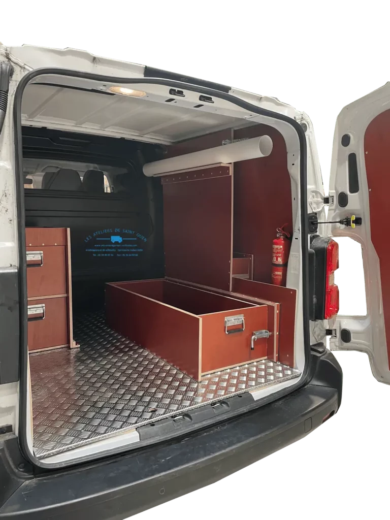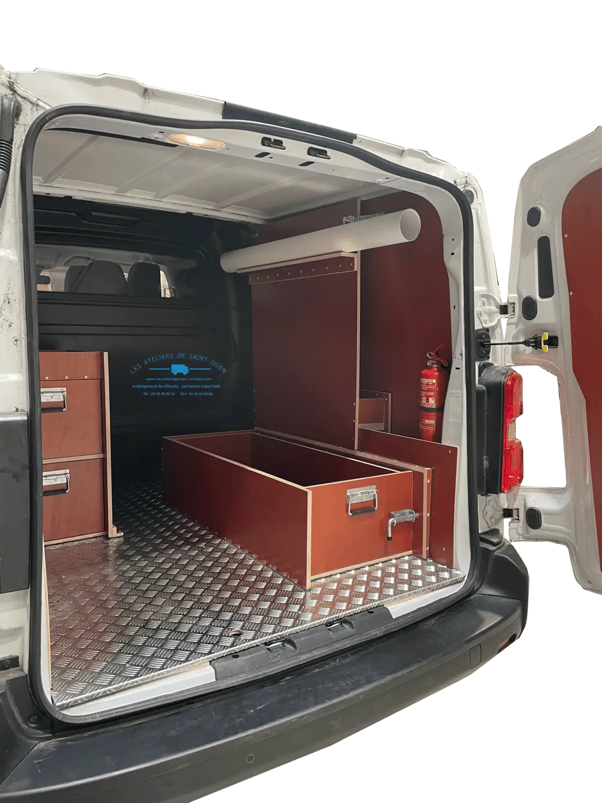 Les Ateliers de Saint-Ouen vous proposent un aménagement sur mesure en aluminium strié, épaisseur 2/3,2 mm, idéal pour les professionnels transportant des charges lourdes ou des matières réglementées.